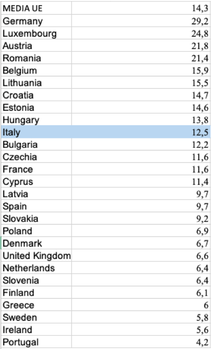 Per comprendere l’entità della variazione di terapie intensive programmata bisogna poi considerare il punto da cui si partiva: una dotazione di terapie intensive e subintensive pari a 12,5 ogni 100.000 abitanti, davvero pochi anche rispetto a molti altri paesi europei, come viene mostrato nella tabella sottostante (i dati riportati in Tabella 1, riferiti al 2012, sono tratti da un articolo scientifico). L’Italia si trova al di sotto della media europea e ha addirittura una disponibilità dei posti letto in terapia intensiva per 100.000 abitanti che è meno della metà della Germania.