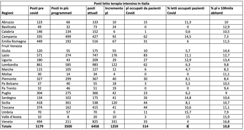 Nel ‘decreto “Rilancio’ di maggio, a tempesta in parte sopita, il Governo italiano aveva tracciato una programmazione di potenziamento dei posti letto in terapia intensiva e subintensiva necessari per la cura dei casi più gravi di polmonite virale da Covid-19. Per quanto concerne le terapie intensive, si prevedeva un aumento di 3.500 posti letto da aggiungere ai 5.179 preesistenti (+67%). Con ulteriori 1.400 circa posti di terapia sub-intensiva programmati si sarebbe arrivati ad una somma di posti per cure critiche (intensiva più sub-intensiva) pari a 12.450 dai precedenti 7.550. Un aumento programmato non trascurabile che avrebbe portato, se compiuto, il rapporto tra terapie intensive e popolazione da 8,5 a 14 posti ogni 100.000 abitanti, e il rapporto terapie intensive + subintensive/popolazione da 12,5 a poco più di 20 per ogni 100.000 abitanti.