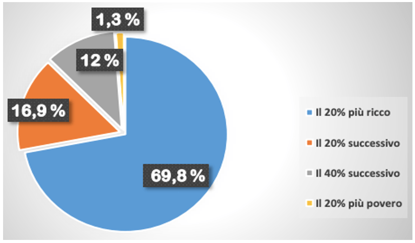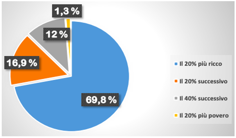 E le cose non vanno meglio quando facciamo riferimento alla ricchezza posseduta. Vediamo a titolo di esempio il caso del nostro Paese nel secondo trimestre del 2019 (prima dell’esplosione della crisi): il 20% più ricco possedeva quasi il 70% della ricchezza nazionale, mentre il 20% più povero soltanto l’1,3% e il 40% intermedio uno sparuto 12% (fonte: Global Wealth Databook 2019 di Credit Suisse, rielaborazione Oxfam).