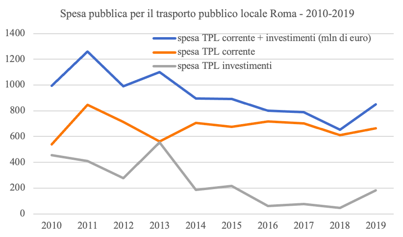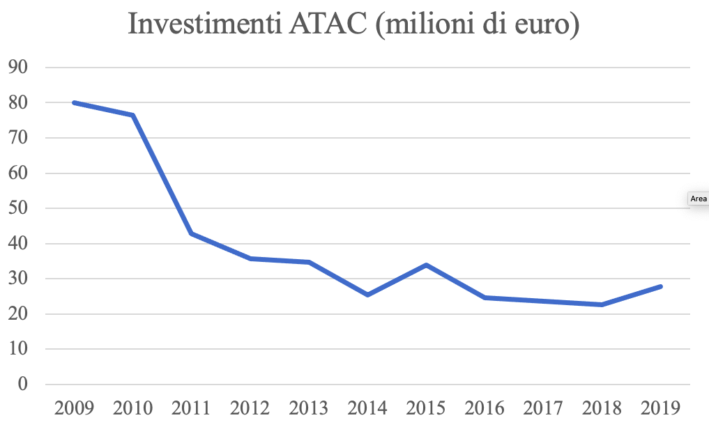 L’Atac romana rappresenta un esempio di questa strategia. I problemi dell’organizzazione del Trasporto Pubblico Locale romano affondano le radici in una storia pluridecennale iniziata con lo sviluppo urbano incontrollato e privo di pianificazione dell’epoca fascista e poi continuata nel secondo dopoguerra con l’edificazione di quartieri mal collegati con il resto della città, l’assenza di una rete metropolitana degna di questo nome e una presenza deficitaria di mezzi pubblici in una città che ha sempre fatto del trasporto privato l’asse fondamentale della mobilità. Questi atavici problemi si sono tuttavia aggravati drammaticamente nel corso degli ultimi due decenni. Al netto delle torbide vicende di scandali e mala gestione, un taglio del finanziamento pubblico ha via via gonfiato il debito di Atac fino all’ultimo passaggio della procedura di concordato avviata dalla giunta Raggi, che ha costretto l’azienda a tagliare il servizio erogato sotto forma di diminuzione delle corse, soppressione di intere linee, fino all’uso di un parco mezzi datato e inquinante. Il sottofinanziamento cronico rispetto alle esigenze di una città come Roma, caratterizzata da un’enorme estensione geografica, è alla base delle condizioni disastrate in cui versa il trasporto pubblico della città. Del resto, i dati al riguardo sono impietosi. In Figura 1 più sotto si vede l’evoluzione del livello di finanziamento del trasporto pubblico locale ad opera del Comune di Roma, nel periodo 2010-2019. La linea blu mostra l’inesorabile diminuzione dei fondi stanziati per i trasporti, che non a caso ha inizio a partire dal 2012. In tale periodo, infatti, prende avvio la fase più dura delle politiche di austerità che hanno colpito tutti i livelli di governo, dallo Stato ai territori, con l’inasprimento dei già rigidi vincoli di bilancio nazionali e locali e una generale ricaduta sui servizi pubblici. Una forte diminuzione si riscontra anche andando a vedere gli investimenti messi in atto da ATAC, in Figura 2. Qui il calo è ancora più marcato, segno inequivocabile di una deliberata scelta politica di prosciugare le risorse necessarie a un buon funzionamento dell’azienda nel presente e, dati gli effetti di lungo periodo degli investimenti, anche nel futuro.