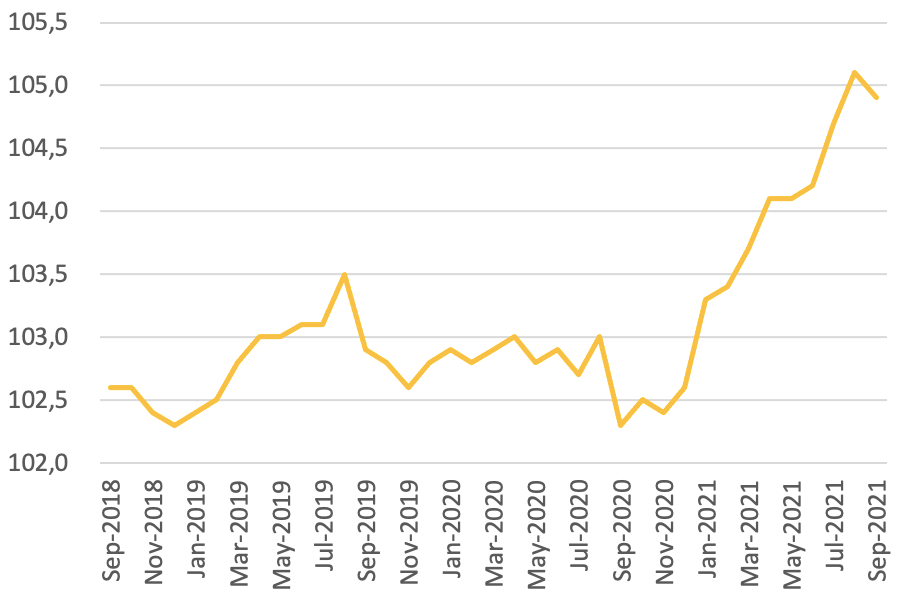 In effetti, negli ultimi mesi abbiamo registrato una discreta crescita dei prezzi. Ad ottobre, i prezzi sono cresciuti, in media, del 3% rispetto allo stesso periodo dello scorso anno. Tale crescita, tuttavia, non fa seguito ad una caduta dei prezzi registrata nei mesi più duri della pandemia: come si può notare dal grafico, tra il 2018 e il 2020 i prezzi sono stati tendenzialmente stabili, per poi iniziare a salire a inizio del 2021.