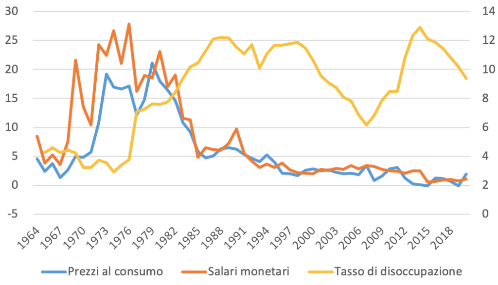 Il 1979 segna tuttavia un segno di svolta: ad un tasso di inflazione del 21% corrisponde un aumento dei salari monetari del 18% (entrambi sull’asse di sinistra del grafico). Da lì in poi il tasso di incremento dei salari inizierà a diminuire, riuscendo sempre meno a garantire la crescita dei salari reali. Se per diversi anni il tasso di crescita dei prezzi era stato inferiore a quello dei salari dell’anno prima, in un tentativo di recupero mai pienamente compiuto, dalla fine degli anni Ottanta in poi il tasso di crescita dei salari monetari stenta a tenere il passo dell’inflazione sperimentata nell’anno precedente: i salari reali iniziano a diminuire e/o stagnare. È così ad esempio nel 1982 e nel 1984; nel 1986; tra il 1992 e il 1997 e nel 2000 quando i salari crescono meno di quanto siano cresciuti i prezzi nell’anno precedente, fino ai giorni nostri con una sostanziale stagnazione a farla da padrone.