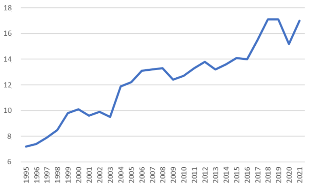 Per trovare il colpevole, infatti, non serve cercare molto lontano: le riforme che hanno trasformato, in poco più di venti anni, il mercato del lavoro italiano da uno dei più rigidi in Europa a uno dei più flessibili (parole del FMI) sono le dirette responsabili. Pochi numeri, impietosi, spiegano meglio di tante parole di cosa stiamo parlando. La figura 1 (dati Eurostat) mostra come la percentuale di lavoratori con un contratto a tempo determinato, cioè precario, sia più che raddoppiata tra il 1995 (7%) e il 2021 (17%).
