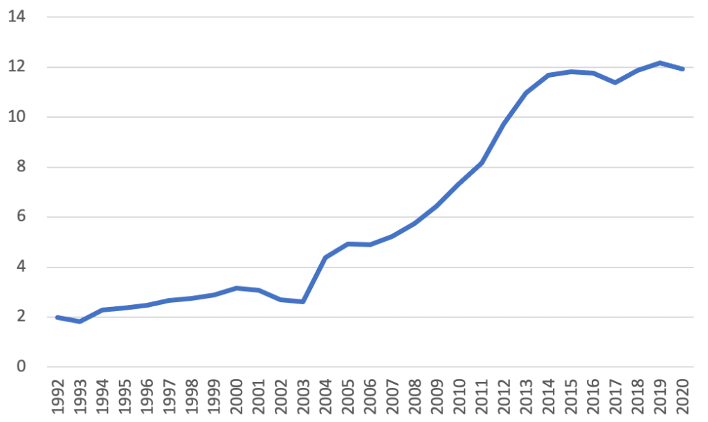 La figura 2 aggiunge un altro tassello: se nel 1992 solo il 2% dei lavoratori si trovava involontariamente in un regime di part-time – cioè era part-time non per scelta, ma per mancanza di alternative migliori – nel 2020 questa percentuale arrivava al 12%.