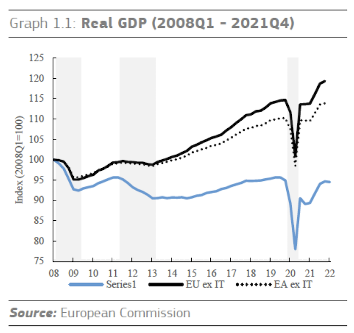 Quello che il report, guarda caso, si dimentica di dire è che in questi quindici anni – e in particolare dal 2011 fino all’inizio della pandemia – siamo stati fra gli alunni più diligenti nello svolgere i “compiti a casa” (leggi: applicare le misure di austerità con continui avanzi primari e eliminare quel poco di misure sociali che restavano), applicando fedelmente i “consigli” che ci ritrovavamo nei report degli anni precedenti: insomma, una lettura che a voler essere onesti equivale a una bocciatura del “maestro”, e non dell’allievo.
