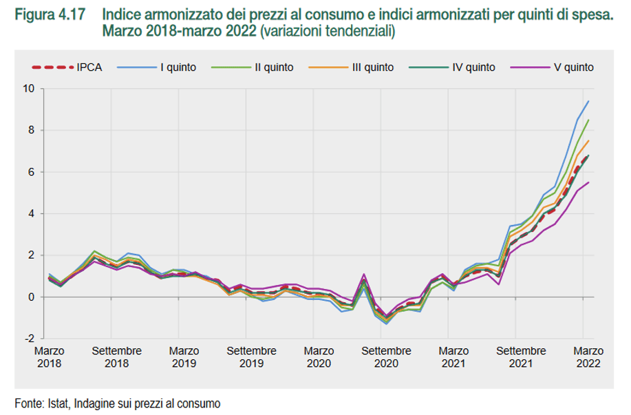 Il punto – e qui il cerchio si chiude – è che se ci concentriamo sui settori dove il peso è maggiore per le famiglie più povere rispetto a quelle più ricche, vediamo che sono proprio gli stessi che hanno mostrato un aumento dei prezzi più marcato. Perciò, se il costo medio dei “carrelli della spesa” è aumentato per tutti, l’aumento è stato più limitato per il quinto più ricco (+5,5% a marzo 2022) ma quasi il doppio (+9,4%) per il quinto più povero. In mezzo tutti gli altri, ma comunque ISTAT ci dice che per i primi 3 quinti (cioè il 60% della popolazione) il tasso di inflazione effettivo è stato superiore alla media nazionale.