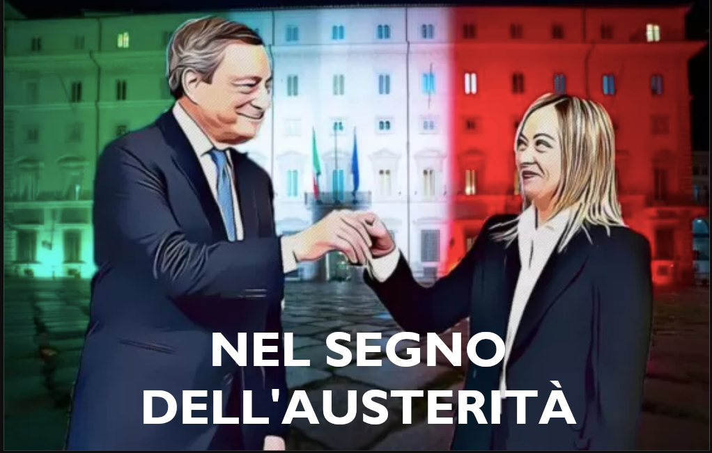 Per piegarli, occorre ripristinare la più dura austerità, esattamente come scritto nero su bianco nella NADEF del Governo Meloni. Il saldo primario del bilancio pubblico, che rappresenta la differenza tra le entrate e le spese al netto degli interessi pagati sul debito pubblico (spese, queste ultime, prive di qualsiasi significativo impatto sociale) passa da un disavanzo dell’1,5% del 2022 ad un disavanzo dello 0,4% per il 2023. Ciò significa che Meloni riporta l’Italia all’interno del paradigma del pareggio di bilancio primario, perché riduce di oltre un punto percentuale il disavanzo primario ereditato da Draghi. Pareggio di bilancio significa che lo Stato toglie all’economia, con le tasse, esattamente tanto quanto eroga verso l’economia in forma di spesa sociale, sussidi, servizi e investimenti pubblici, rinunciando a stimolare la produzione, i consumi e l’occupazione.
