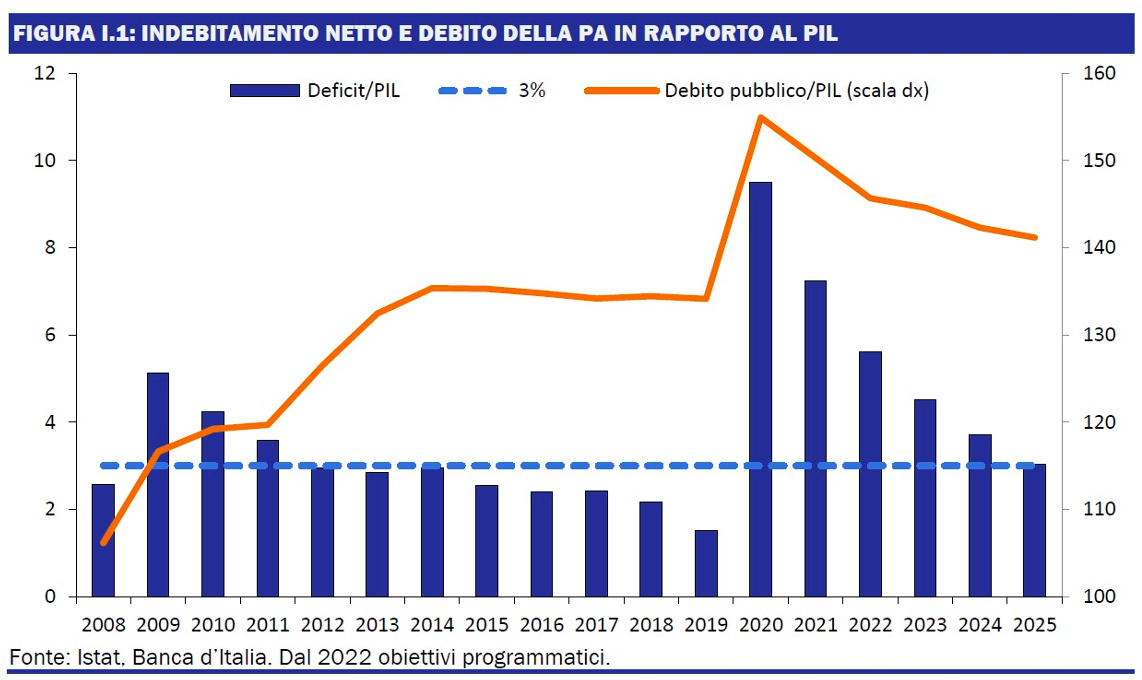 L’attacco è nei numeri perché – come anticipato nella Nota di aggiornamento del Documento di Economia e Finanza (NADEF) – il Governo Meloni farà più austerità del Governo Draghi, raccogliendo il testimone di un percorso di contenimento della spesa sociale e aumento delle tasse che si era interrotto a causa della pandemia e delle misure rese necessarie dall’emergenza sanitaria. Dunque, come mostra un grafico della NADEF rivelatore della perfetta continuità politica Draghi-Meloni, il nuovo Governo tiene fede all’impegno, assunto dal precedente, di ridurre debito e deficit pubblico rispetto al PIL.