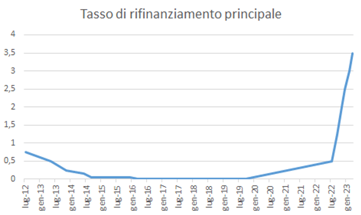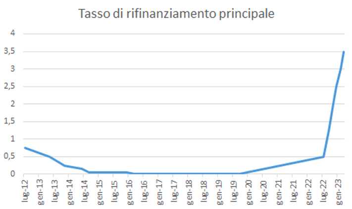 Recentemente, la Presidente della Banca Centrale Europea (BCE), Christine Lagarde, ha affermato l’intenzione di aumentare i tassi d’interesse di mezzo punto percentuale. L’obiettivo dichiarato di questo rialzo è quello di contenere la corsa dell’inflazione. Nel dettaglio, la misura di politica monetaria prevede l’aumento del tasso di rifinanziamento principale dal 3% al 3.5%. Mezzo punto potrà sembrare, a molti, una cosa da poco, ma non è così. In primis perché, come vedremo, si tratta di decimali che a fine mese contano, e non poco, per chi si è accollato o si deve accollare un mutuo. In secondo luogo, perché questo aumento fa seguito ad altri aumenti, avvenuti nei mesi scorsi (si veda il grafico sotto), che hanno portato i tassi ai livelli di oggi partendo da un livello prossimo allo zero.