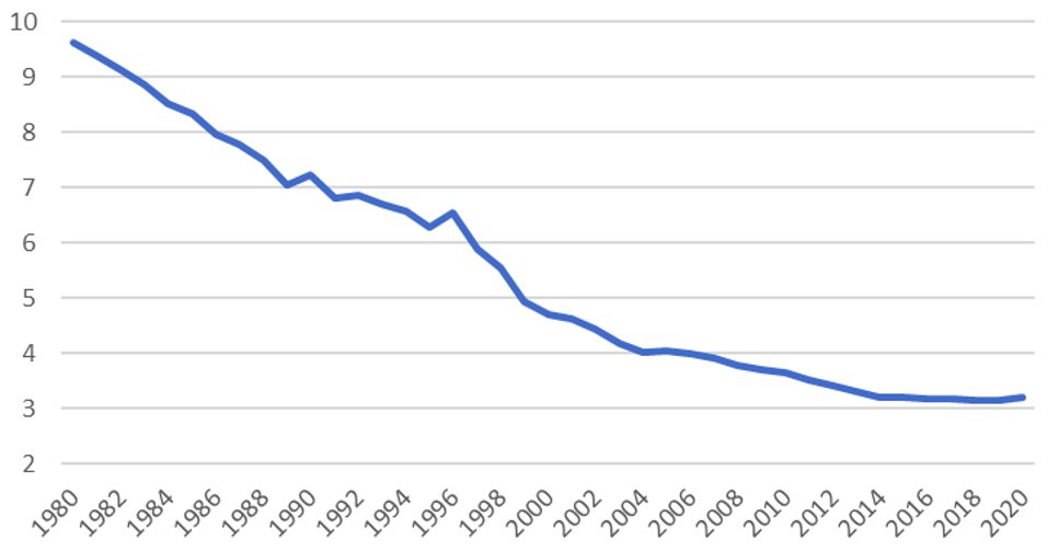 Posti letto ospedalieri ogni 1000 abitanti, Italia (1980-2020). Fonte: OCSE