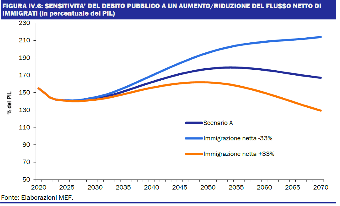 Il messaggio è eloquente: con un aumento dei flussi migratori di un terzo, ci troveremmo nel 2070 con un debito pubblico in rapporto al PIL minore di circa il 30%. Una sorta di toccasana per la salute dei conti pubblici italiani, una medicina capace di curare il più annoso dei nostri problemi. Tutto questo avverrebbe in virtù di un semplice meccanismo: la maggior parte dei migranti è giovane, quindi in età lavorativa. Ad un loro aumento aumenta l’offerta di lavoro e di conseguenza, seguendo la teoria economica dominante, aumentano la produzione e il reddito (cioè il PIL) del paese di arrivo. In tale maniera un dato stock di debito pubblico ha, quindi, un peso minore a fronte di un PIL in crescita e risulta più sostenibile. Un simile ragionamento appare anche in un recente rapporto della Ragioneria dello Stato, dove il discorso è esteso alla spesa sanitaria e la spesa pensionistica, la cui sostenibilità migliorerebbe all’intensificarsi dei flussi migratori. E d’altronde l’ex presidente dell’INPS Tito Boeri aveva già fatto di questo tema un suo cavallo di battaglia, aggiungendo una nota di sfacciataggine che a rileggerla ora quasi è difficile crederci. Secondo il ragionamento di Boeri, infatti, i lavoratori stranieri pagano regolarmente contributi previdenziali e pensionistici, ma in una rilevante proporzione non rimarranno in Italia a sufficienza per godere anche dei benefici pensionistici che ne conseguirebbero. Cioè, pagano dei contributi per una pensione che non riscuoteranno mai, perché torneranno prima o poi nel loro Paese d’origine e lasceranno i cittadini autoctoni a beneficiare dei loro contributi.