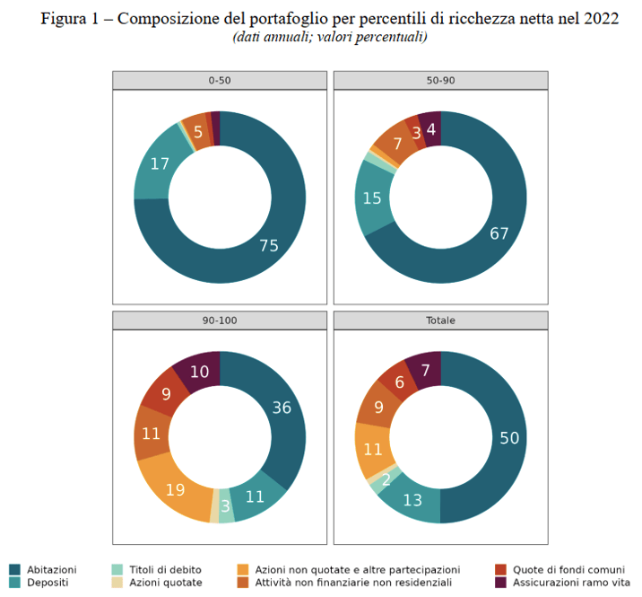 In nostro aiuto arriva un comunicato stampa di Banca d’Italia dove possiamo trovare vari grafici interessanti. Il primo ci spiega come è costituita la ricchezza della popolazione italiana e di come questa composizione cambi se parliamo del 50% più povero o del 10% più ricco.