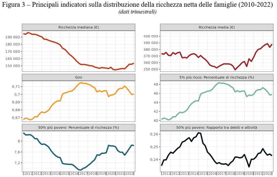 L’Italia è caratterizza quindi da una forte e crescente disuguaglianza nella distribuzione della ricchezza (che va di pari passo con l’aumento storico della disuguaglianza dei redditi). Si tratta di una piaga sociale che può essere affrontata soltanto invertendo drasticamente la rotta delle politiche economiche, sia a monte sia a valle del problema. A monte la disuguaglianza della ricchezza è legata strettamente alla disuguaglianze dei redditi e del potere di acquisto delle persone, ovvero alla crescente disuguaglianza tra bassi salari ed alti profitti e alla crescita della disparità salariale tra salari direttivi (manageriali) e salari ordinari, nonché all’assenza di politiche sociali che favoriscano l’accesso al patrimonio immobiliare e a mutui o affitti agevolati, senza i quali la capacità di risparmio delle famiglie si riduce drasticamente. A valle la redistribuzione della ricchezza (e del reddito) passa per una politica tributaria che sia in grado di tassare in ottica fortemente progressiva gli alti redditi e le grandi ricchezze (immobiliari e finanziarie) redistribuendo così le risorse a chi ha meno sotto forma di redditi integrativi e di servizi pubblici capillari.