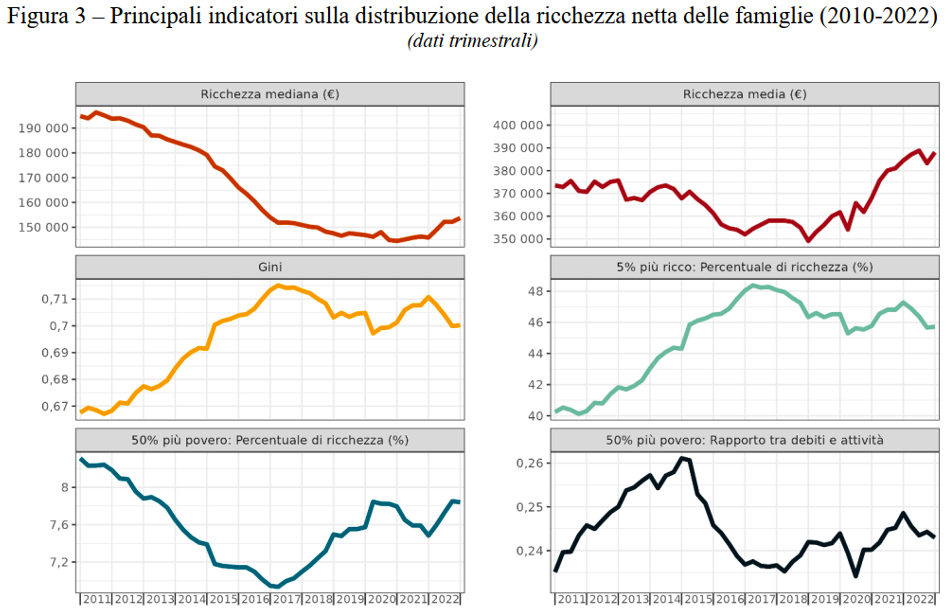 L’Italia è caratterizza quindi da una forte e crescente disuguaglianza nella distribuzione della ricchezza (che va di pari passo con l’aumento storico della disuguaglianza dei redditi). Si tratta di una piaga sociale che può essere affrontata soltanto invertendo drasticamente la rotta delle politiche economiche, sia a monte sia a valle del problema. A monte la disuguaglianza della ricchezza è legata strettamente alla disuguaglianze dei redditi e del potere di acquisto delle persone, ovvero alla crescente disuguaglianza tra bassi salari ed alti profitti e alla crescita della disparità salariale tra salari direttivi (manageriali) e salari ordinari, nonché all’assenza di politiche sociali che favoriscano l’accesso al patrimonio immobiliare e a mutui o affitti agevolati, senza i quali la capacità di risparmio delle famiglie si riduce drasticamente. A valle la redistribuzione della ricchezza (e del reddito) passa per una politica tributaria che sia in grado di tassare in ottica fortemente progressiva gli alti redditi e le grandi ricchezze (immobiliari e finanziarie) redistribuendo così le risorse a chi ha meno sotto forma di redditi integrativi e di servizi pubblici capillari.